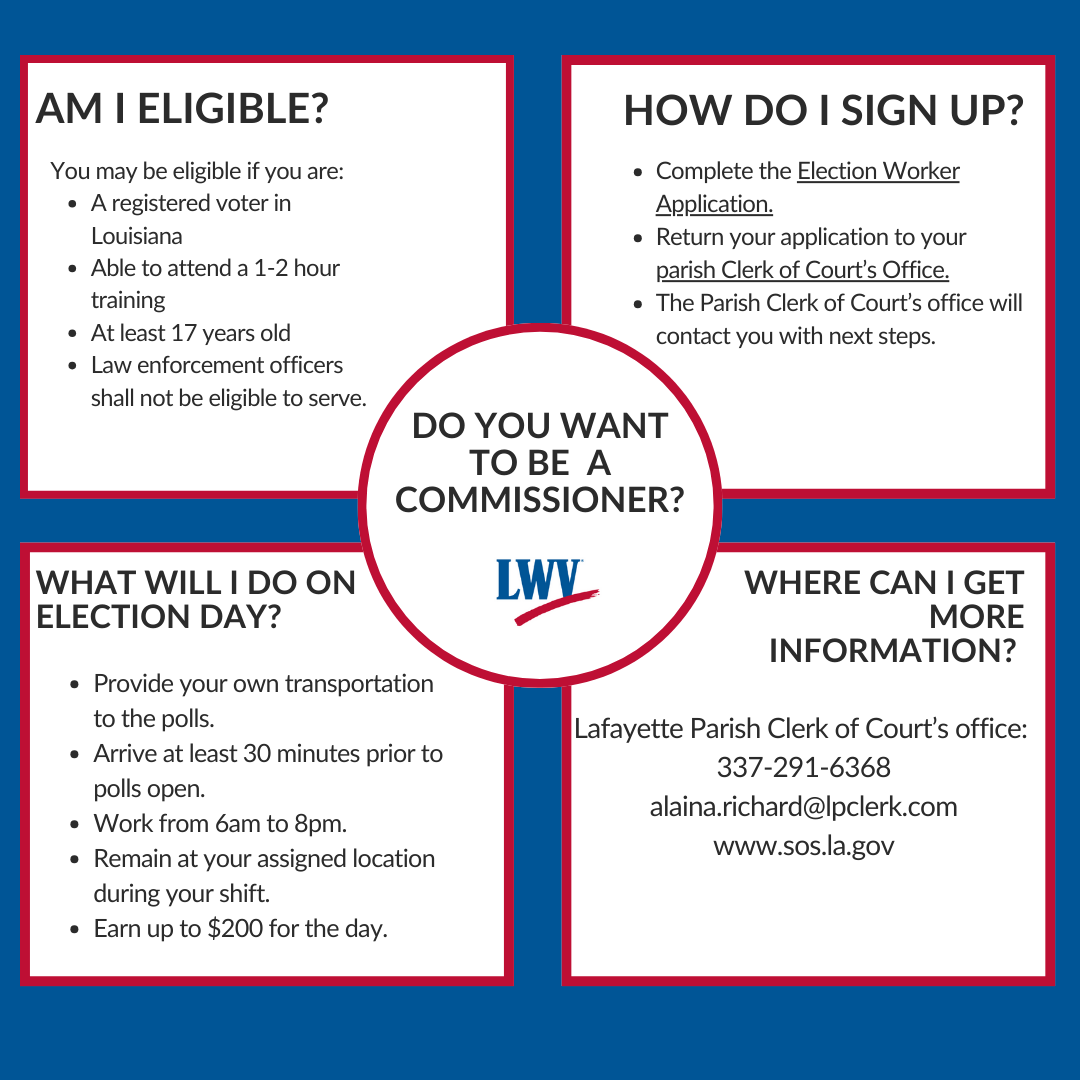 Meet with the Lafayette Parish Clerk of Court, Louis Perret, on Wednesday, March 6th, at 5:30pm to learn how you can become an election day worker. The event will take place at the Clifton Chenier Auditorium, 220 W. Willow St. Building C.